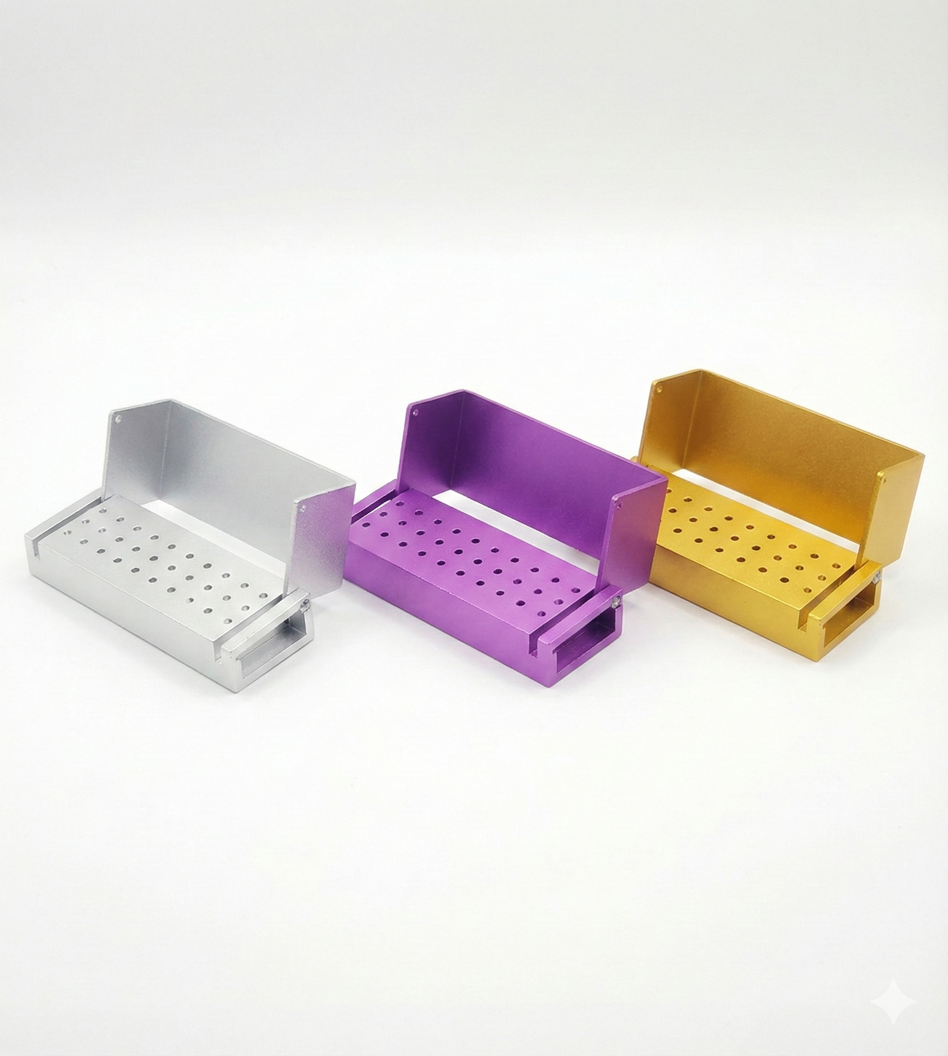 Organizador metálico de 30 espacios con tapa protectora, diseñado para almacenar y transportar fresas dentales con seguridad. Su construcción robusta mantiene las herramientas organizadas y protegidas del polvo y la humedad. Ideal para clínicas, laboratorios y profesionales que requieren acceso rápido y orden en su instrumental rotatorio. La tapa asegurada evita derrames durante el traslado.