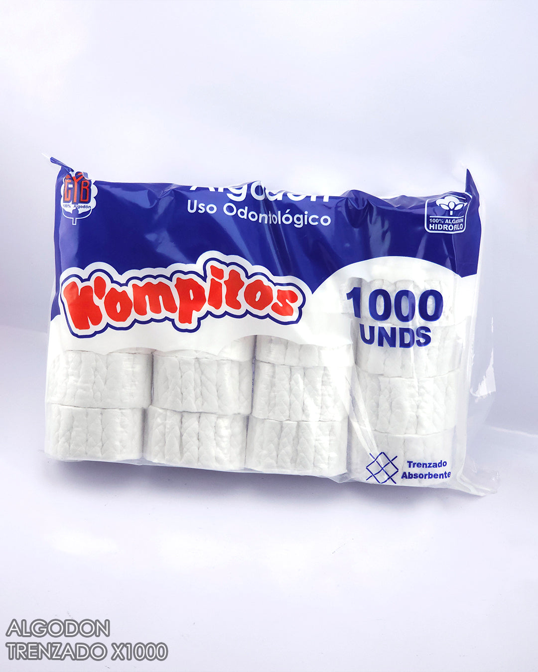 Algodón trenzado de alta densidad, ideal para procedimientos clínicos y control de humedad en cavidad oral. Presentación en paquete de 1000 unidades, garantiza disponibilidad continua en consultorio. Estructura trenzada proporciona mayor absorción y resistencia durante manipulación. Producto estéril y de calidad profesional, cumple con estándares de higiene dental. Esencial para hemostasia, aislamiento relativo y acabados en tratamientos restauradores y endodónticos.
