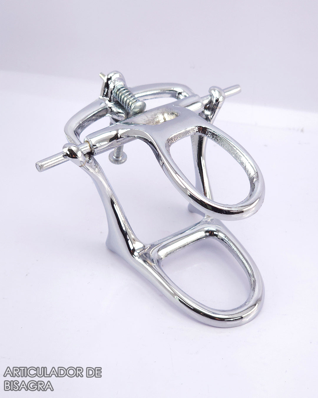 Articulador de bisagra sencillo diseñado para procedimientos odontológicos básicos. Este instrumento facilita el posicionamiento y estabilización de modelos de yeso durante la toma de registros oclusales y ajustes de prótesis. Construcción robusta con bisagra de precisión que permite movimientos controlados y repetibles. Ideal para clínicas y laboratorios dentales que requieren una solución confiable y económica para articulación de modelos. Fácil de limpiar y mantener.