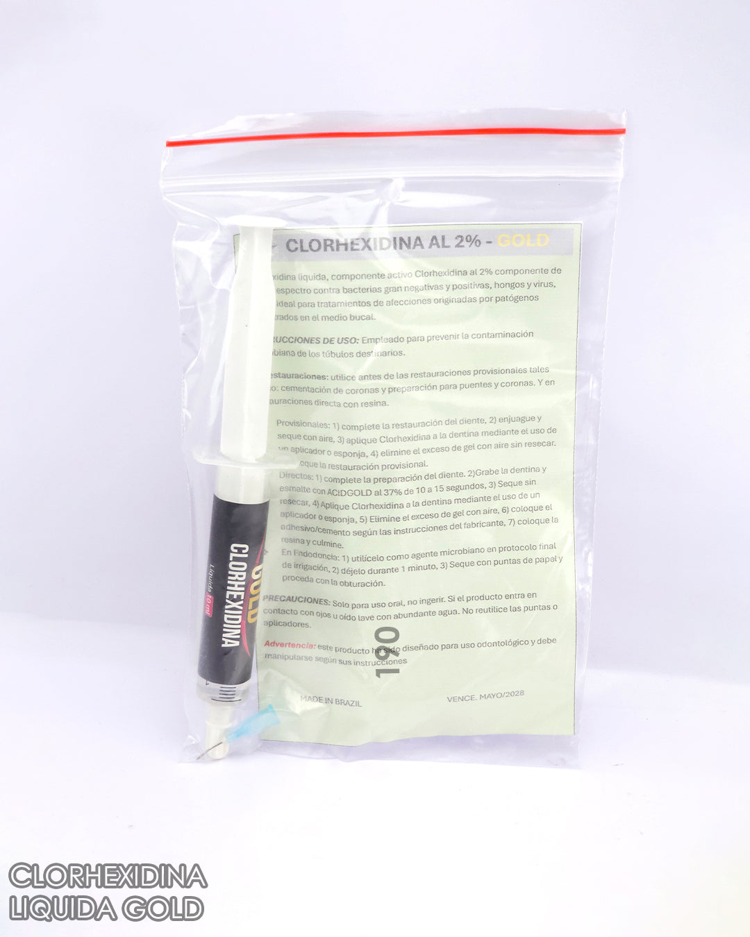 Solución antiséptica de clorhexidina al 2% en presentación líquida Gold con jeringa dosificadora. Ideal para enjuagues bucales, irrigación quirúrgica y desinfección de cavidades en procedimientos odontológicos. Su formato en jeringa permite aplicación precisa y controlada en áreas de difícil acceso. Ampliamente utilizada en protocolos de higiene preoperatoria y postoperatoria. Efectiva contra bacterias gramnegativas y grampositivas, hongos y algunos virus. Presentación profesional de alta concentración para consultorios y clínicas dentales.
